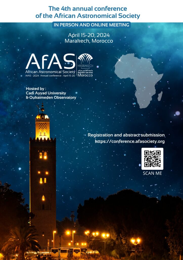 The African Astronomical Society (AfAS) extends an invitation to the upcoming AfAS Annual Conference from 15th to 20th April 2024 (AfAS-2024). We are pleased to announce that this event will be conducted in a hybrid format, offering online and in-person participation options. It will be hosted by Cadi Ayyad University and the Oukaimeden Observatory (OUCA) in the vibrant city of Marrakech, Morocco.