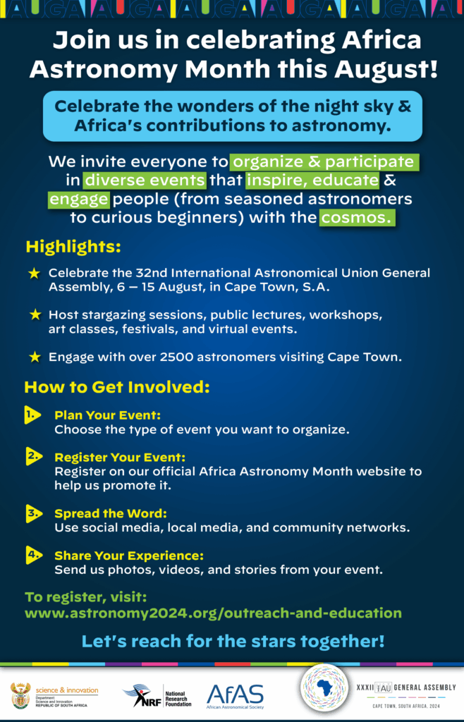 Dear Fellow Astronomy Enthusiasts, We are thrilled to announce the celebration of Africa Astronomy Month this coming August 2024! This special month is dedicated to the wonders of the night sky and the incredible contributions Africa is making to the field of astronomy. We invite everyone across the world to join us in organizing and […]