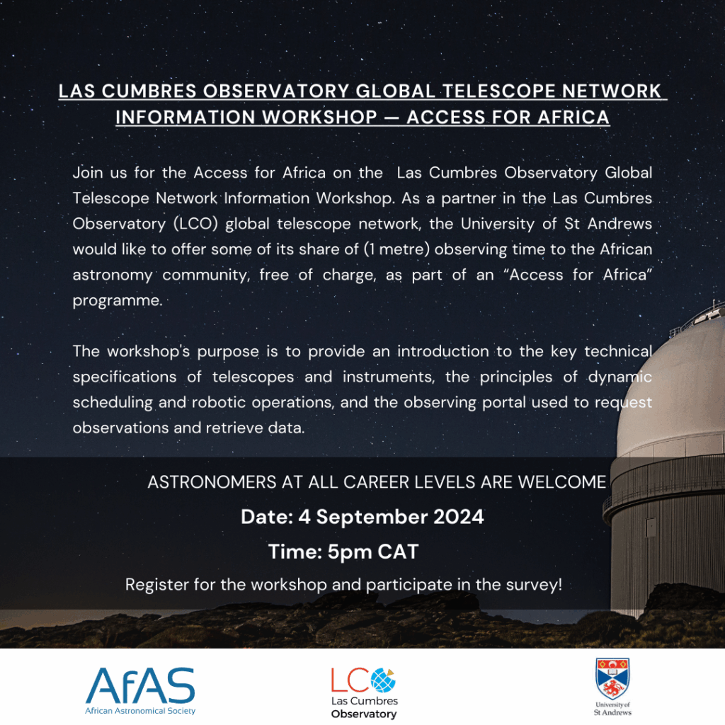 As a partner in the Las Cumbres Observatory (LCO) global telescope network, the University of St Andrews would like to offer some of its share of (1m) observing time to the African astronomy community (free of charge) as part of an “Access for Africa” program. LCO is a unique globally distributed network of robotically controlled […]