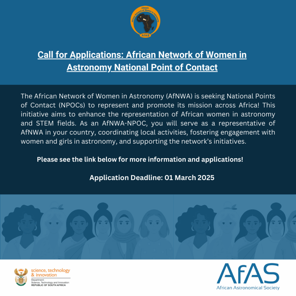 The African Network of Women in Astronomy (AfNWA) is seeking National Points of Contact (NPOCs) to represent and promote its mission across Africa! This initiative aims to enhance the representation of African women in astronomy and STEM fields. As an AfNWA-NPOC, you will serve as a representative of AfNWA in your country, coordinating local activities, […]