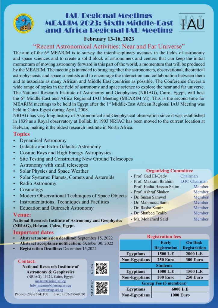 UncategorizedMEARIN VI: Sixth Middle-East and African Regional IAU Meeting Visit: http://mearim6.nriag.sci.eg Astronomy in Africa Scholarships Latest Newsletter Now available: September 2022
